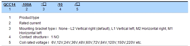 When ordering, please state the following: name, full model, control coil voltage specification, installation frame type, whether with auxiliary contact, order quantity. For example: DC Contactor QCC14-100A/10/24V 100pcs, indicating the load rated current 100A, without auxiliary contact, default mounting bracket, coil control voltage 24V purchase 100pcs. Special voltage specification products, such as user needs can be special order.